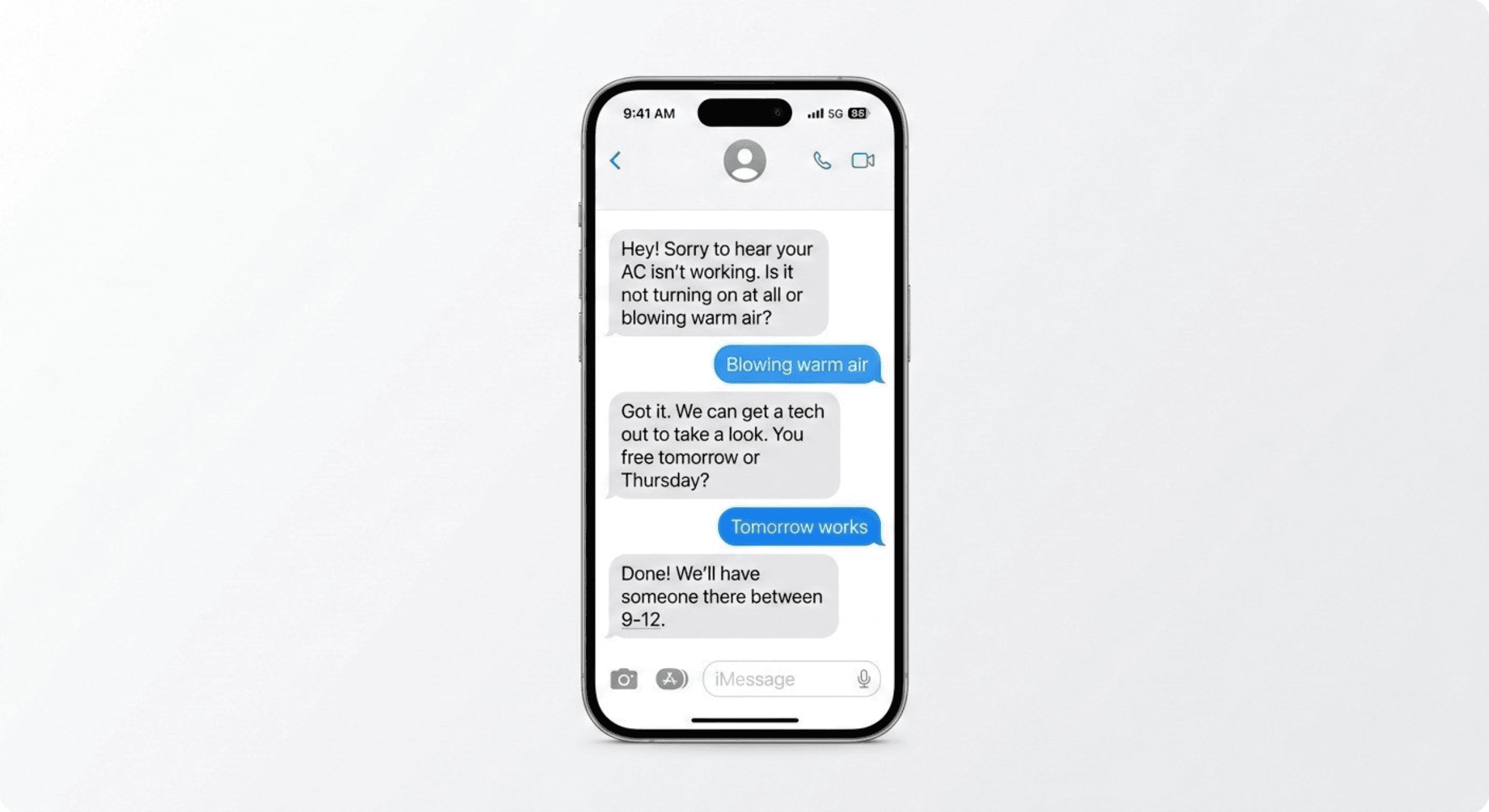 HVAC Lead Response texts back every lead within 60 seconds. It finds out what's wrong, answers basic questions, and books a technician visit. It works nights, weekends, and holidays. It never calls in sick.